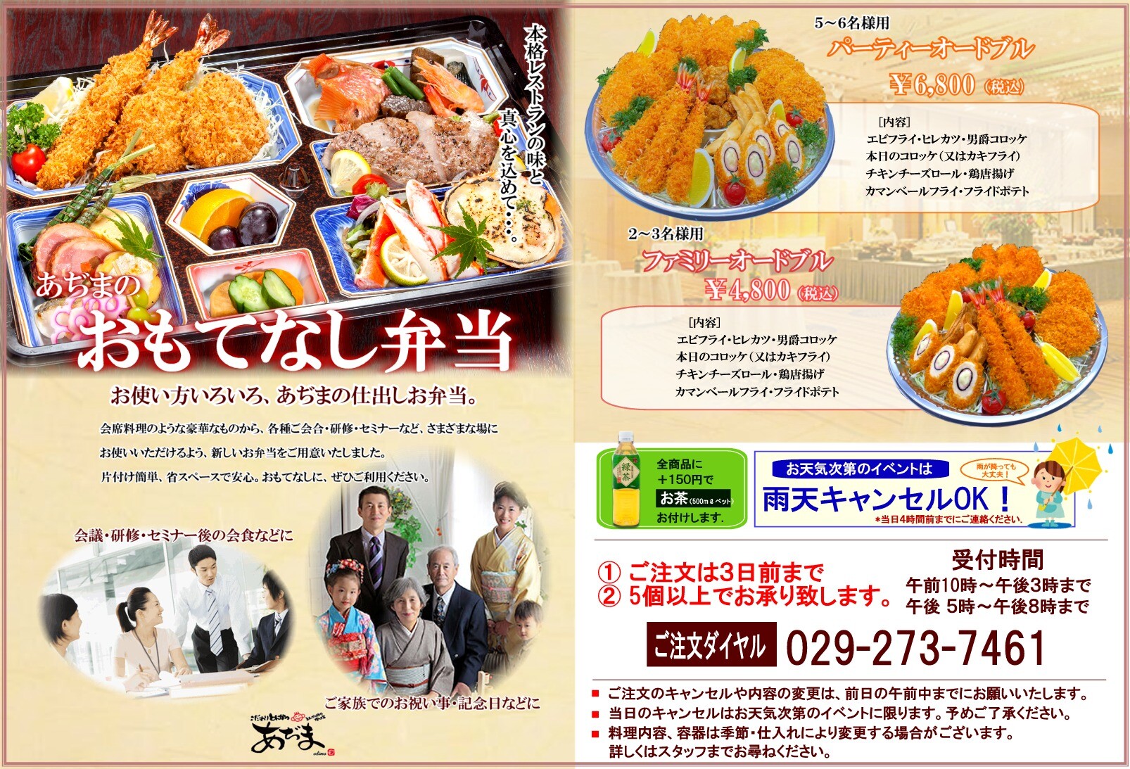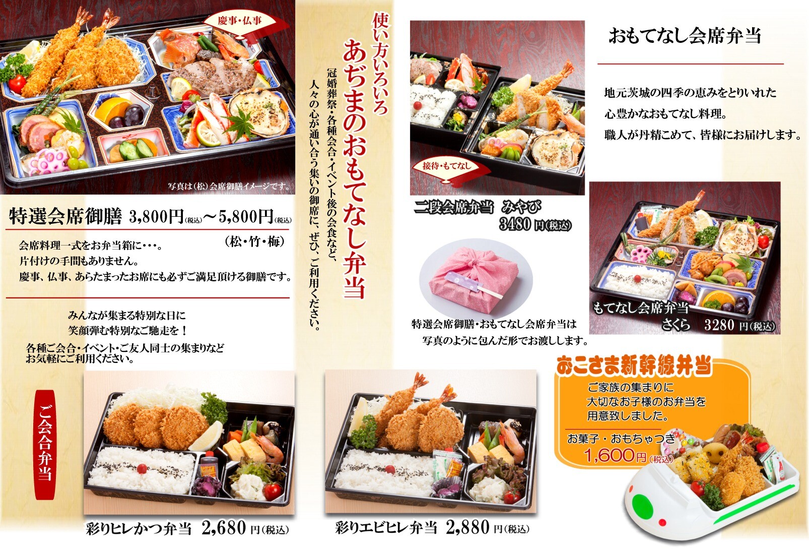おもてなし弁当 【おもてなし弁当】 特選会席御膳(松・竹・梅) 3,800円~5,800円 冠婚葬祭・各種会合・イベントの会食、気軽に友達同士での会食などに 会席料理一式をお弁当箱に・・・ あらたまったお席にも必ずご満足いただける御膳です。 ご注文は5日前までにお願いいたします。 二段会席弁当 みやび もてなし会席弁当 さくら 【ひたちなか本店おもてなし弁当】 【水戸京成店おもてなし弁当】